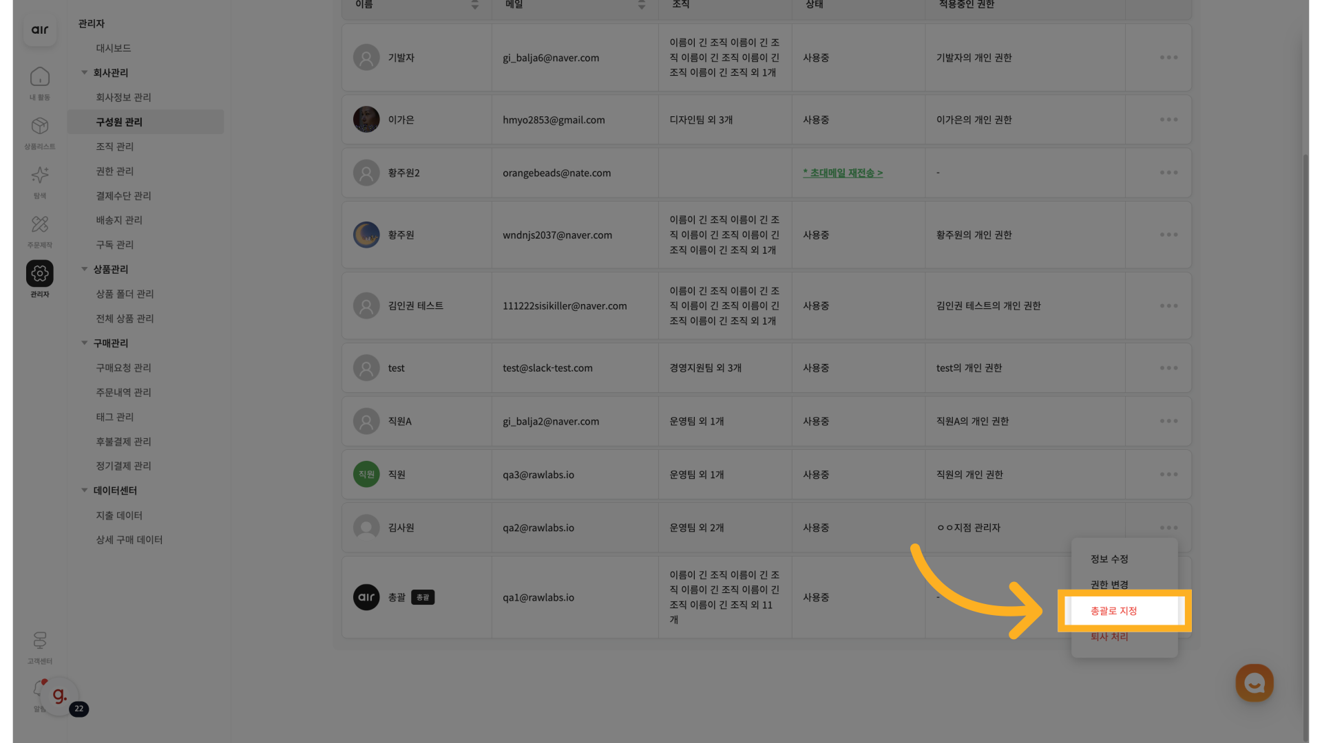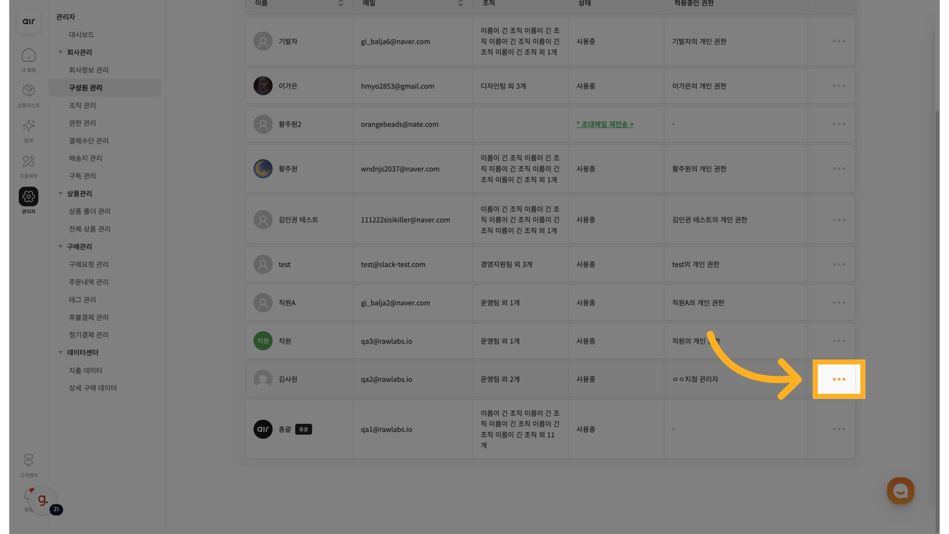 2. 총괄관리자로 지정하고 싶은 직원 정보 우측의 ... 버튼을 클릭해요.