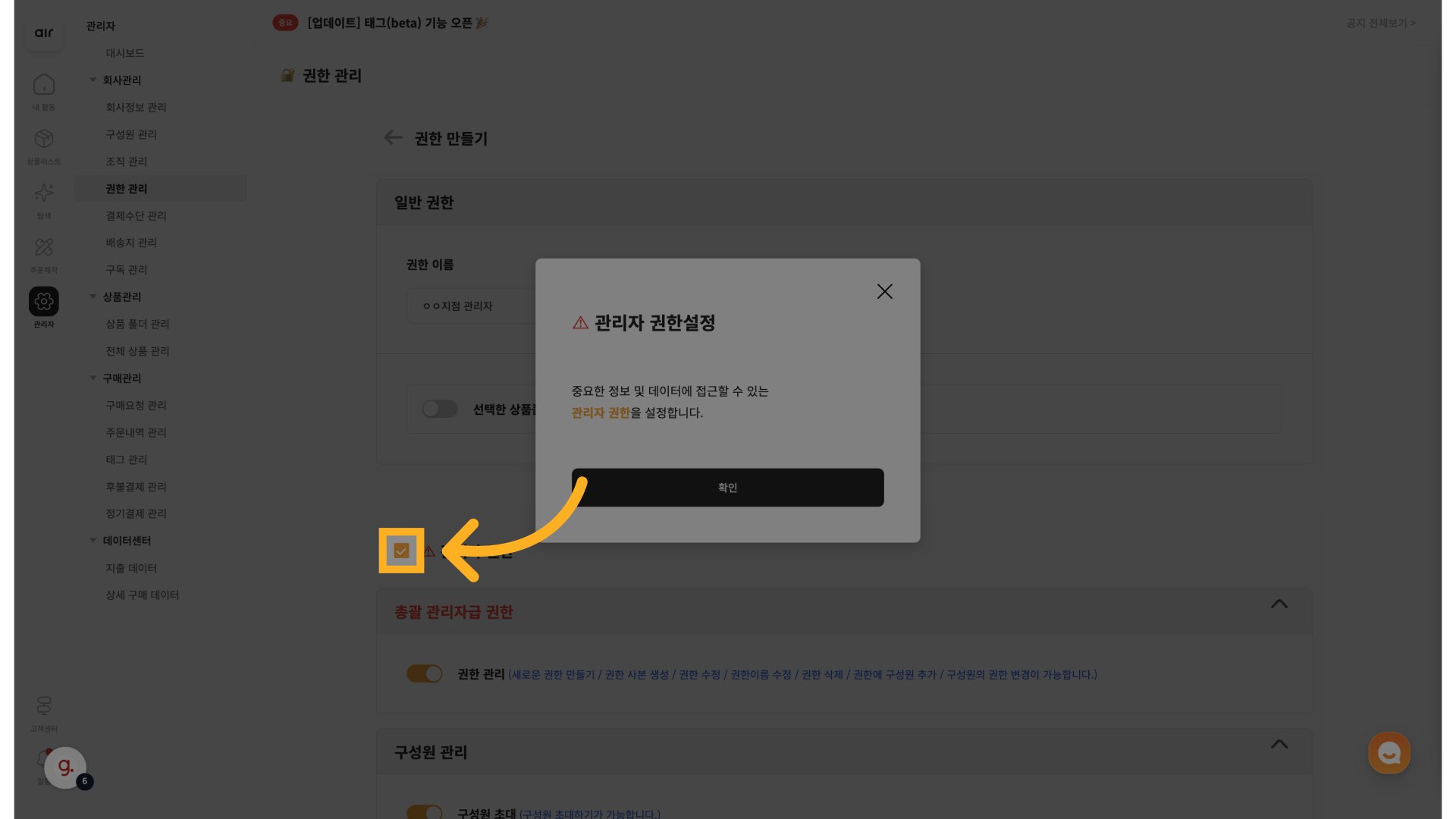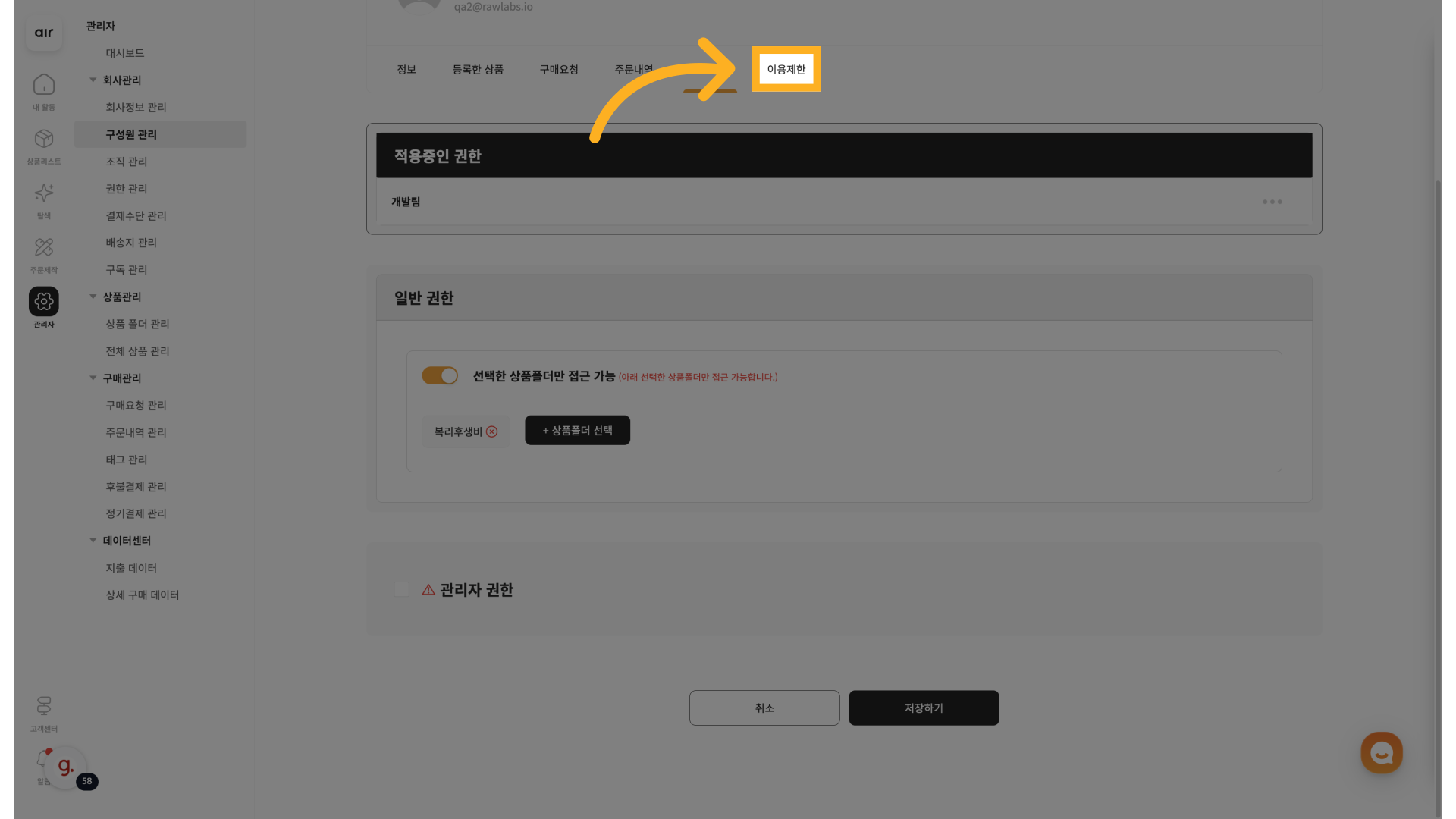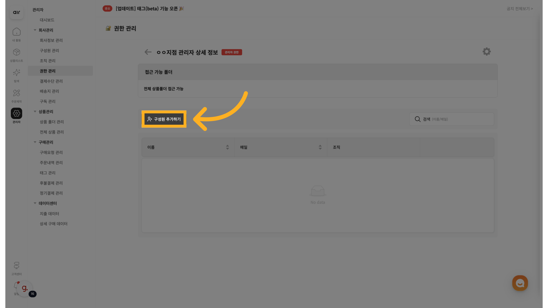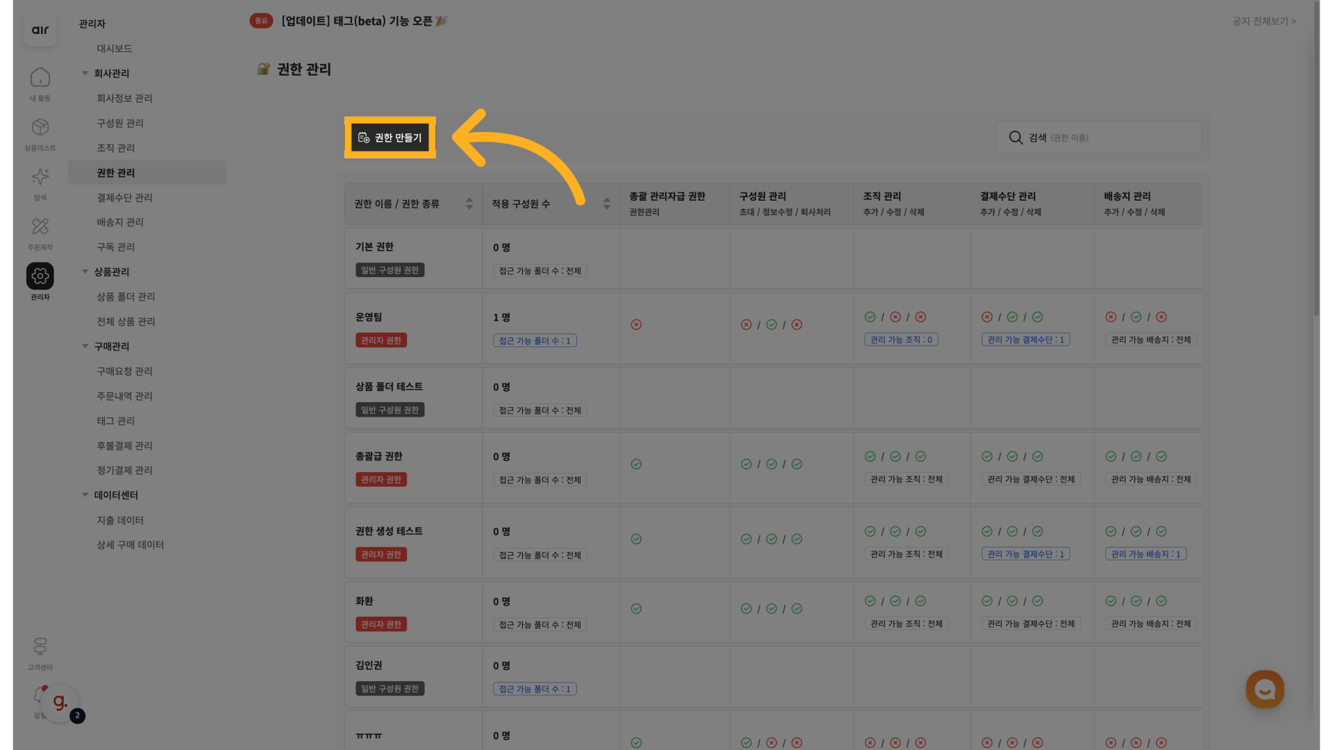 1. 관리자 페이지의 [회사 관리-권한 관리] 페이지에서 구성원을 추가하고 싶은 권한을 선택해요