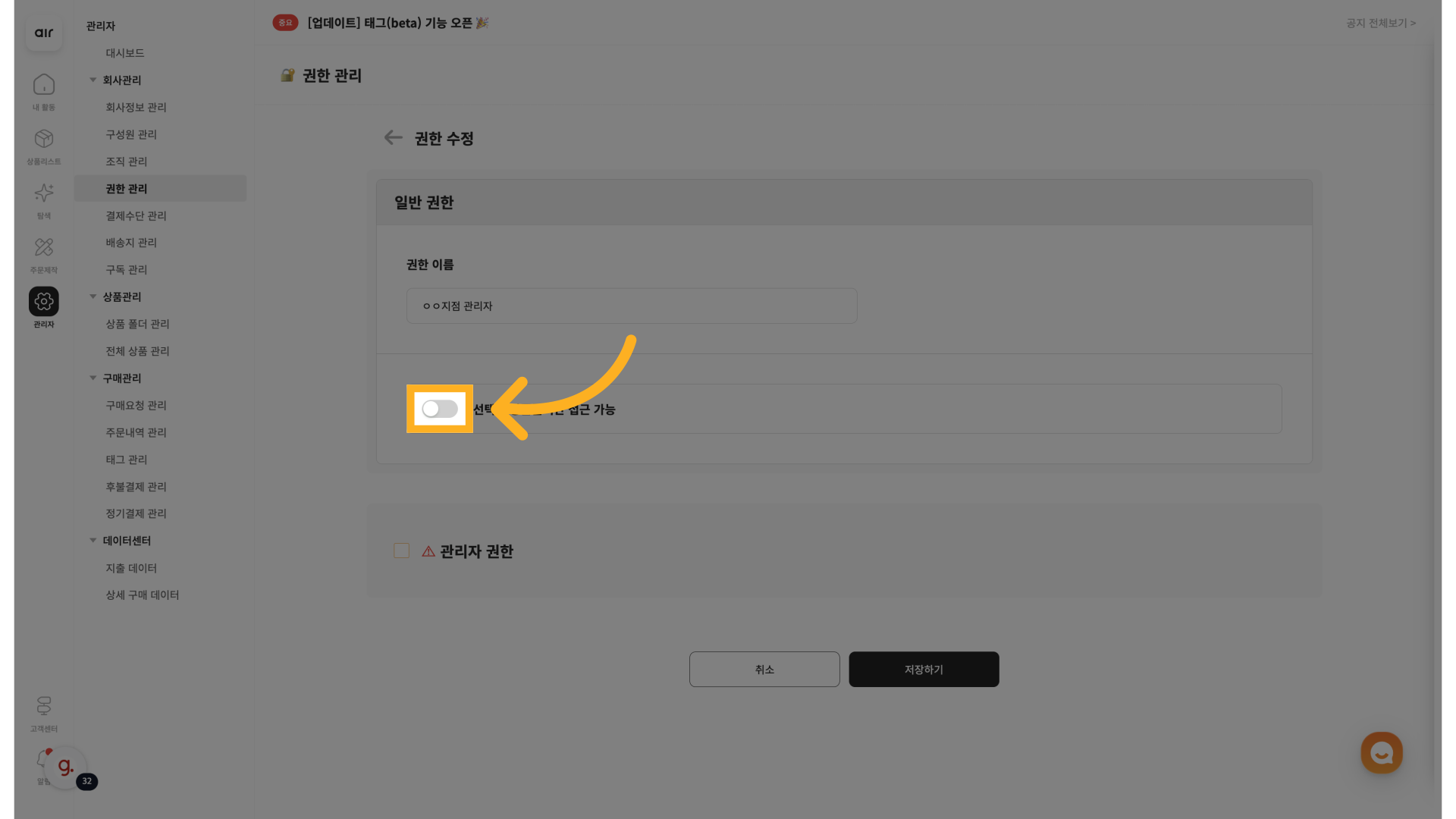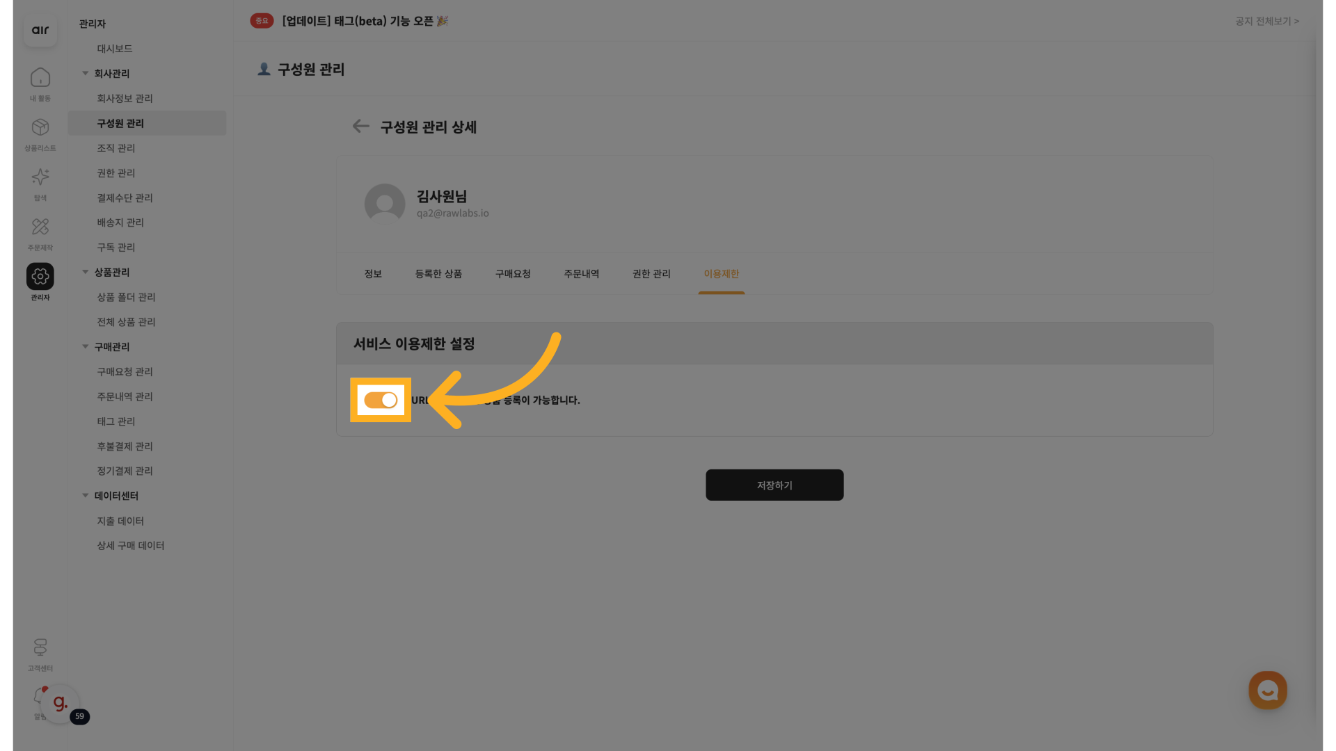 3. 'URL 입력을 통한 상품 등록이 가능합니다' 토글을 OFF상태로 변경한 뒤, 저장하기 버튼을 누르면 해당 권한을 가진 구성원의 상품 등록을 제한할 수 있어요.