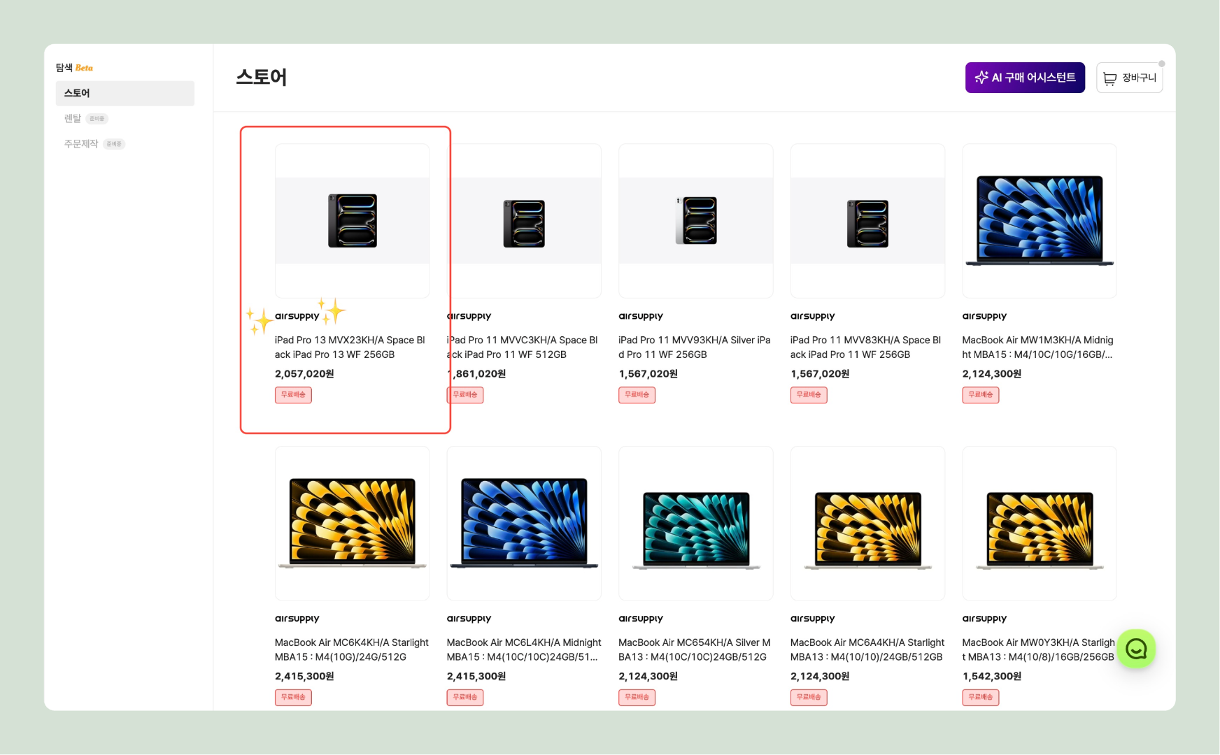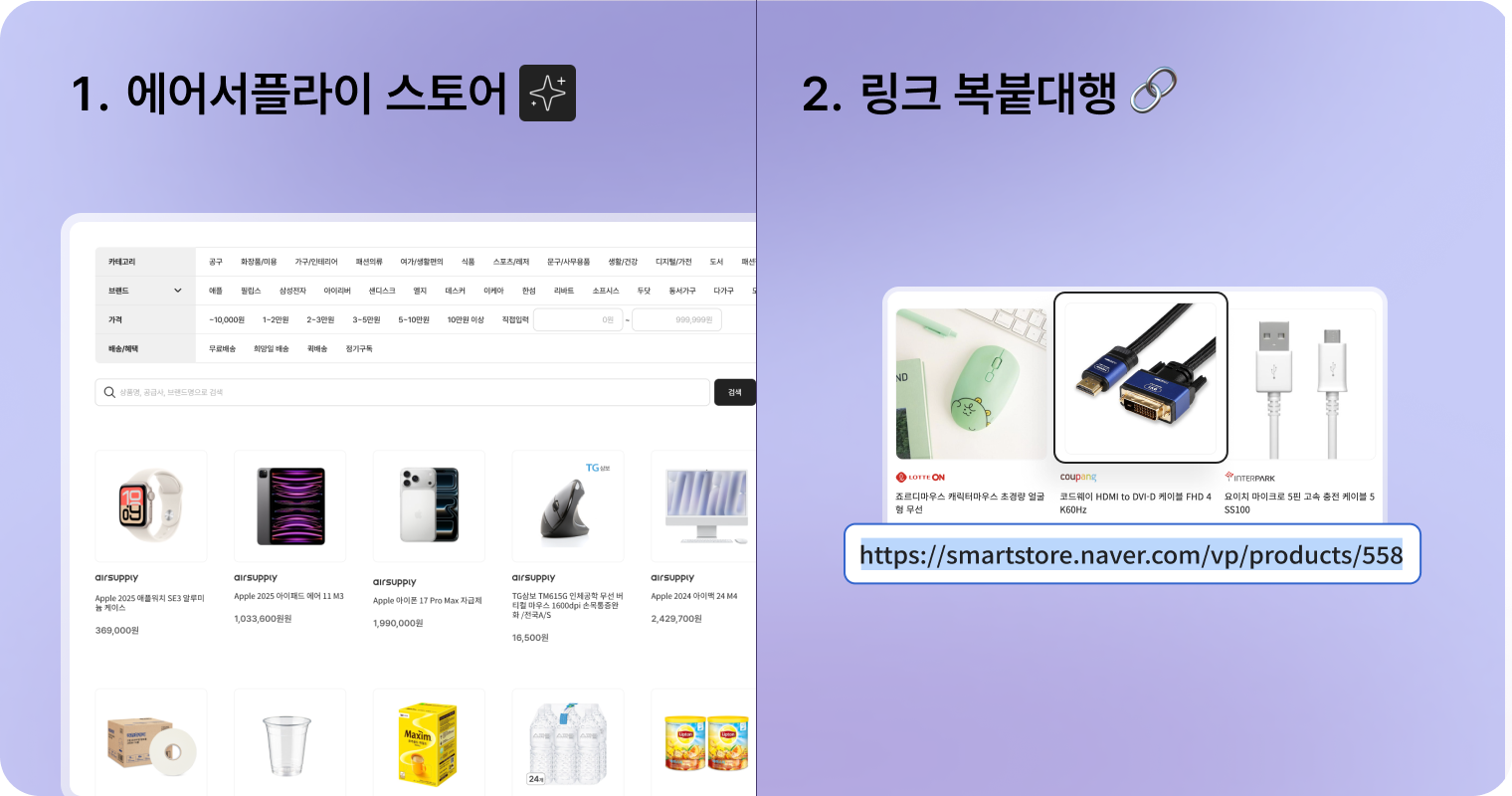 에어서플라이 '스토어'내에서 검색해서 상품을 구매하거나, 스토어에 없는 상품을 링크로 등록해 구매대행을 진행하는 방식이에요.