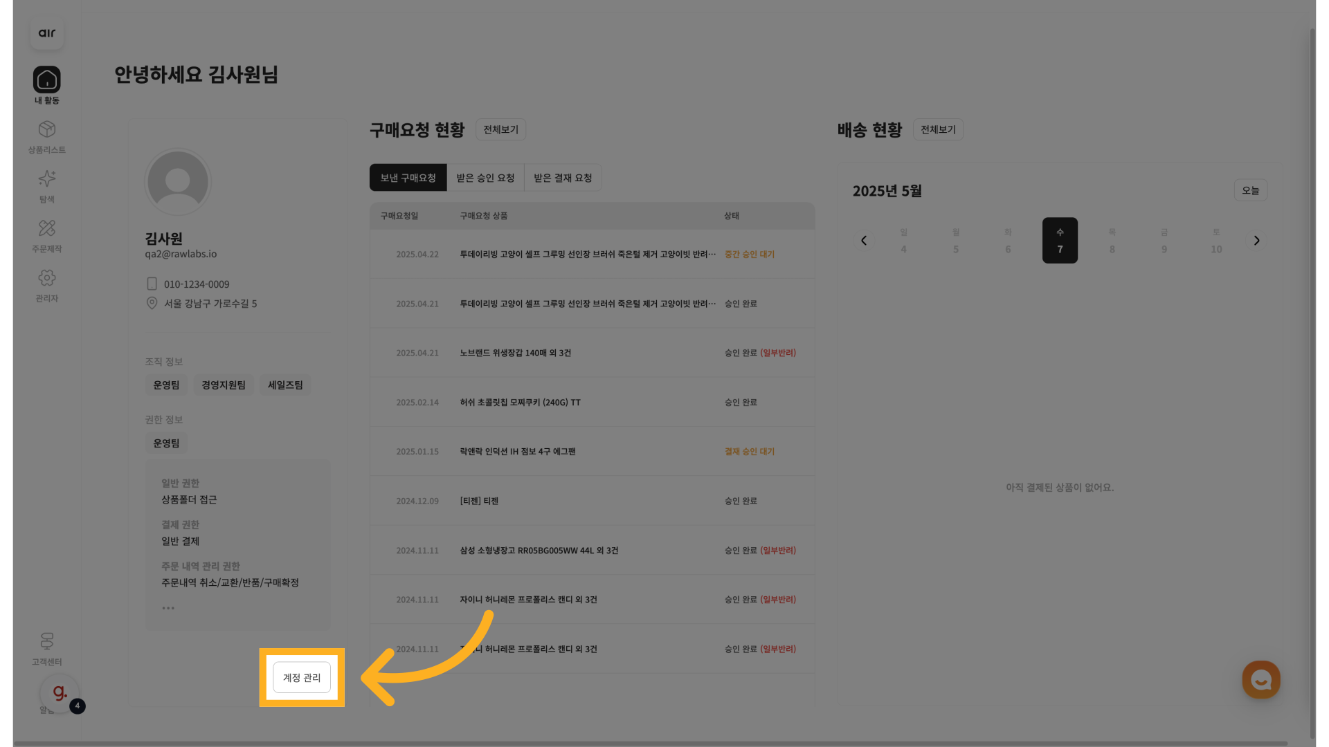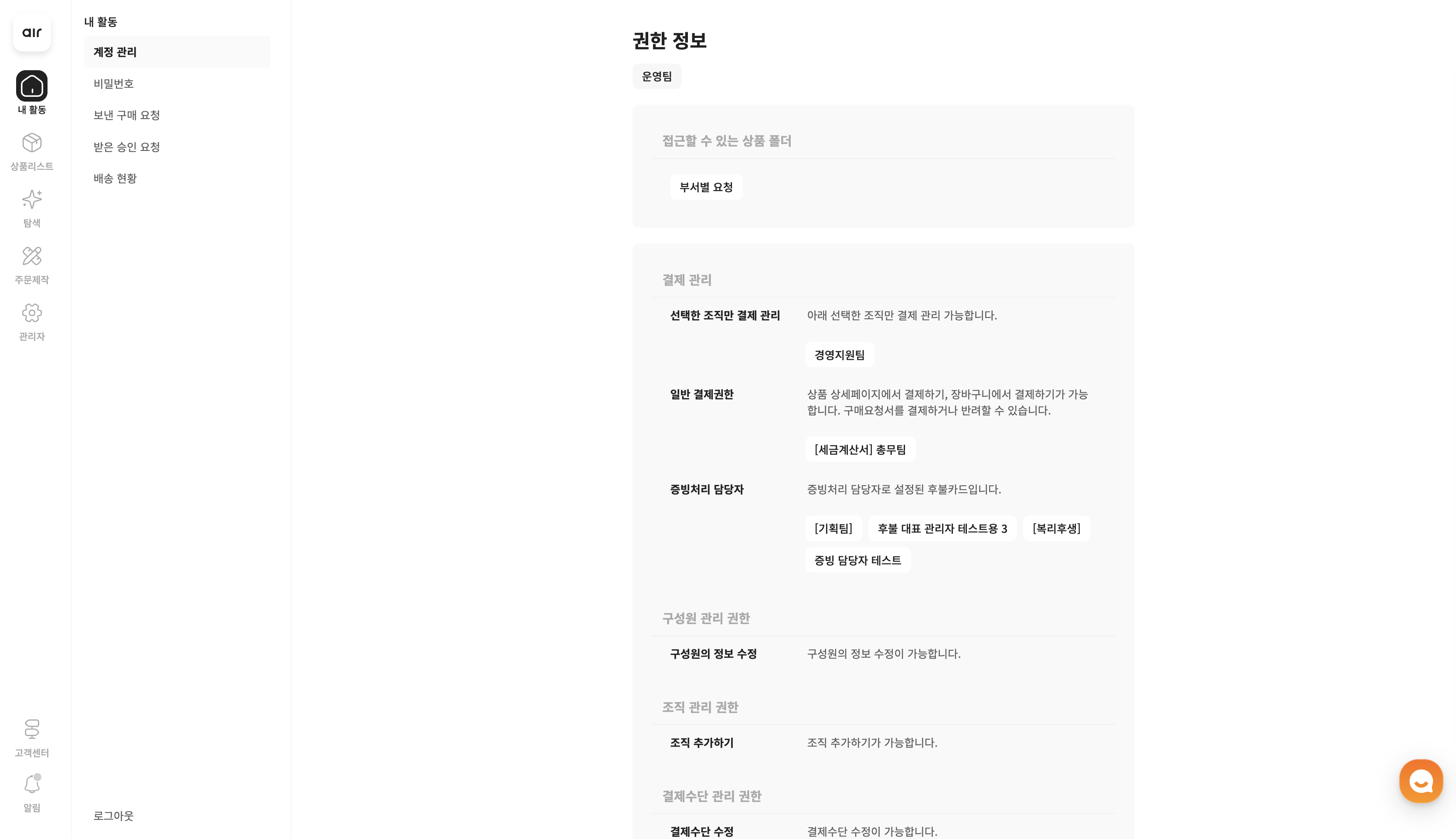 내 권한 확인하기좌측의 내 활동 아이콘을 클릭합니다.계정 관리 페이지 좌측 하단의 '계정 관리' 버튼을 클릭합니다.'권한 정보' 영역에서 내가 가지고 있는 권한을 확인할 수 있어요.권한 변경은 총괄관리자, 혹은 권한 수정 권한을 가진 담당자에게 요청할 수 있어요. 관리자 정보를 확인하고 싶다면 사내 경영지원 부서에 문의해주세요!