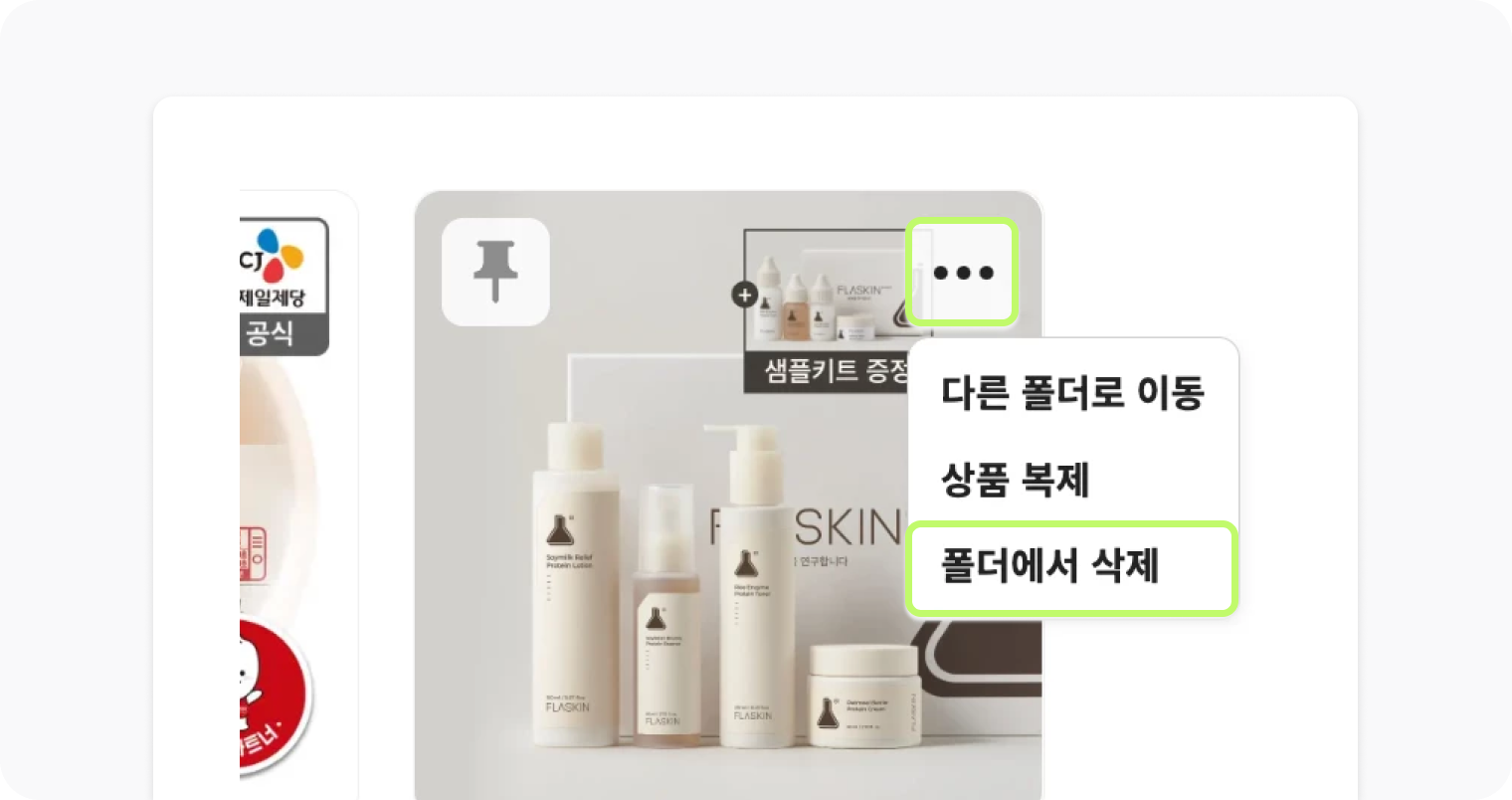 폴더에서 삭제하고 싶은 상품에 마우스를 올려 더보기(...) 아이콘을 클릭하고 '폴더에서 삭제'버튼을 클릭하면 상품이 삭제됩니다.