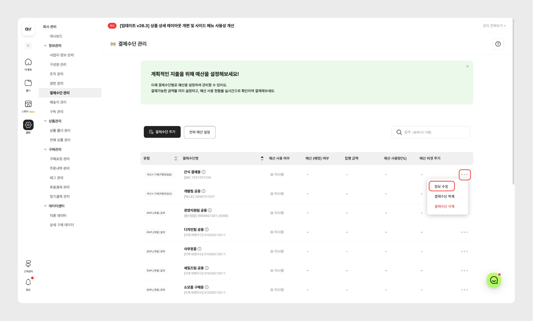 결제수단 관리메뉴로 이동합니다.정보 수정 진입: 권한을 설정할 후불카드 우측의