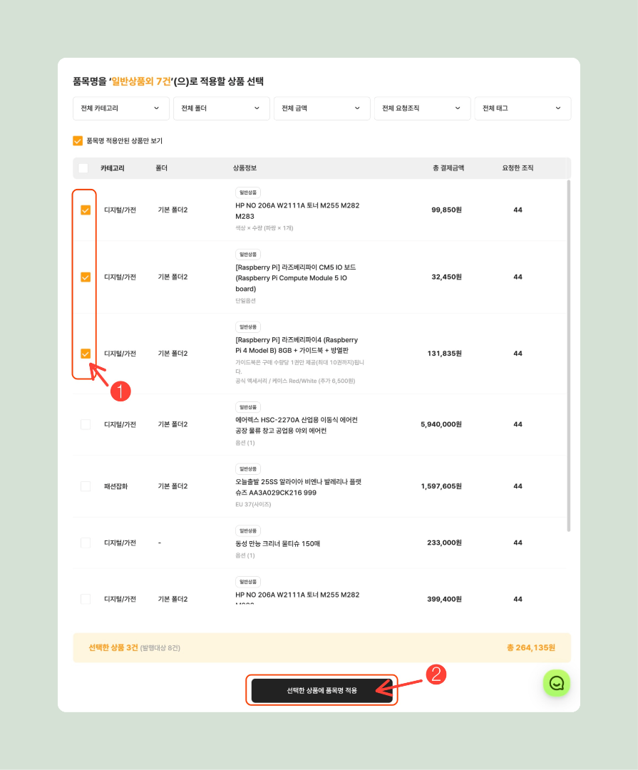 품목명 영역에서 [상품 선택]을 클릭하면 입력한 품목명을 적용할 상품을 선택할 수 있어요.