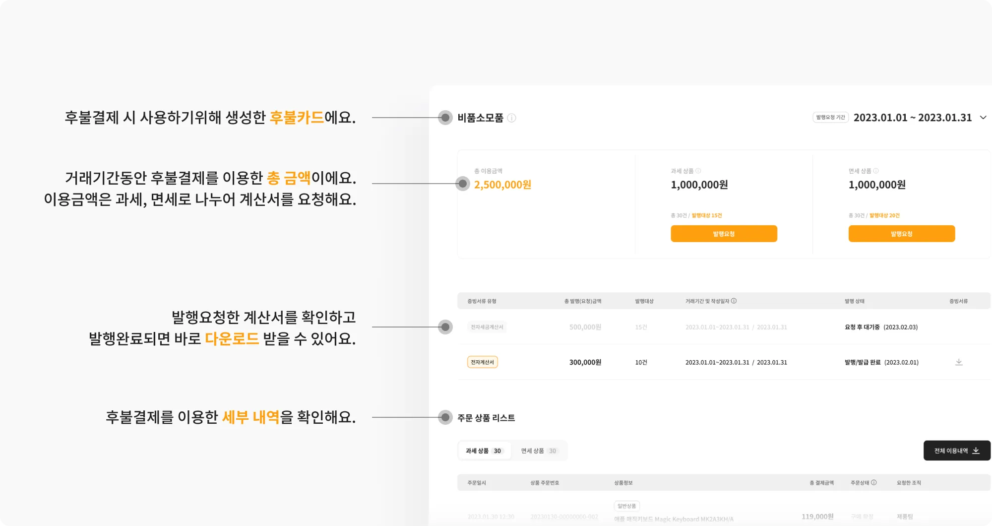 동일한 후불카드로 결제한 상품들의 세금계산서를 나누어 발행할 수 있어요.