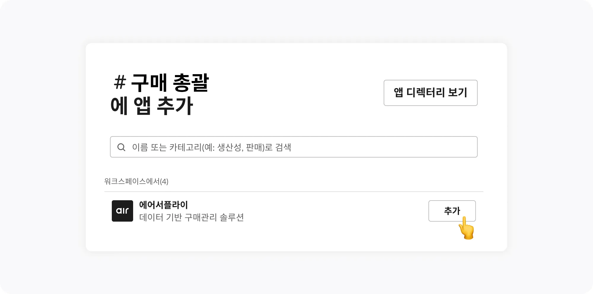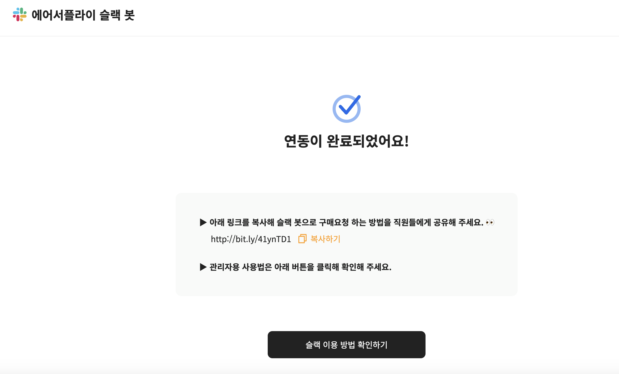 에어서플라이 계정이 있고,  결제 권한이 있는 구성원은 에어서플라이 슬랙 봇 페이지에서 슬랙 관리자로 연동할 수 있어요. 연동 후엔 슬랙으로 요청받은 상품을 결제할 수 있어요.