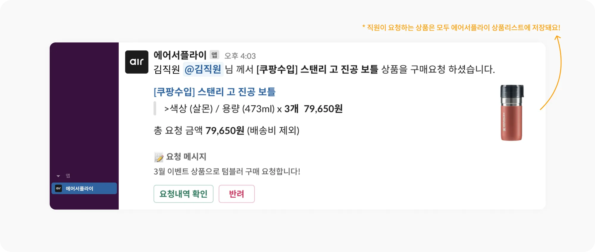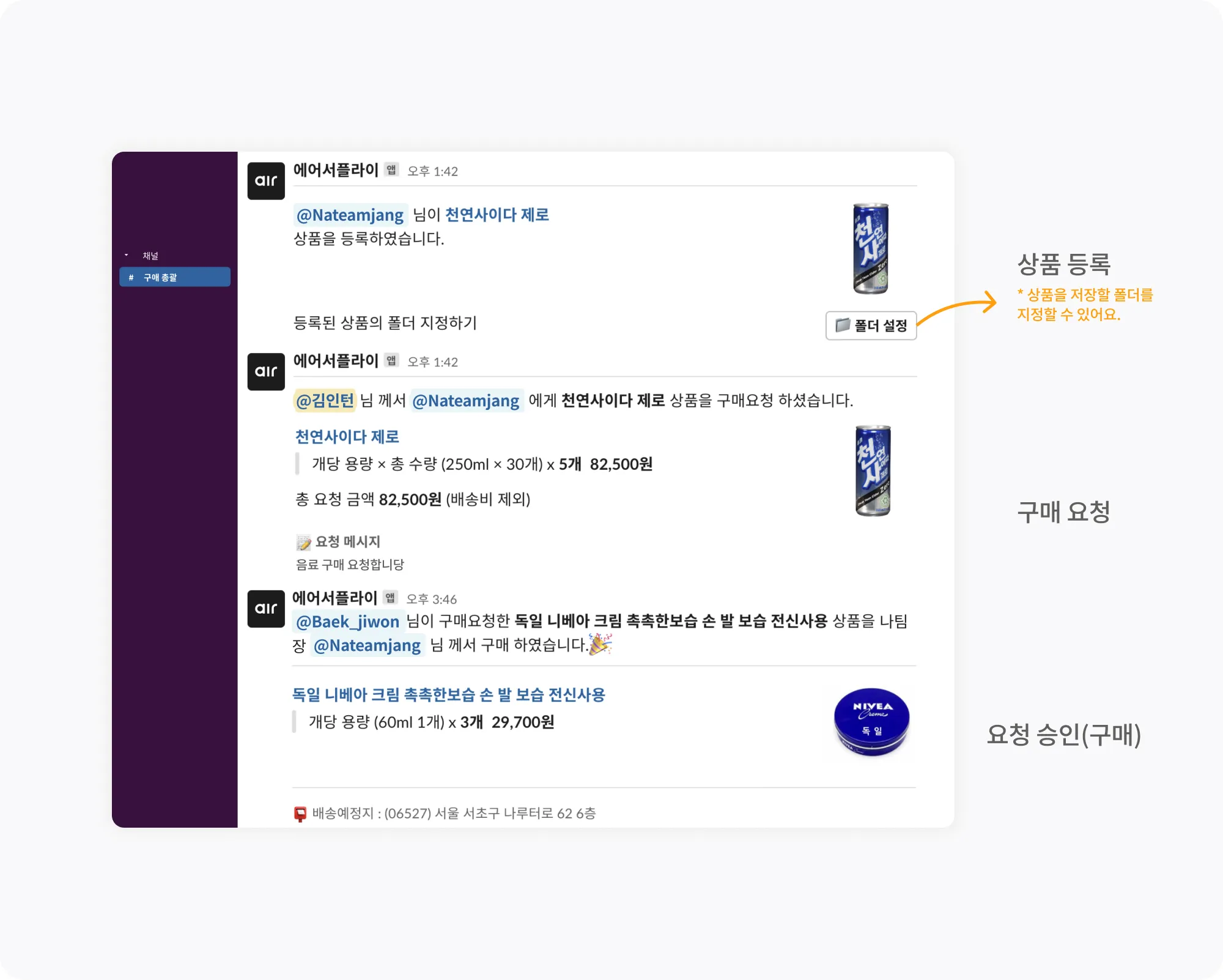 2. 요청 온 상품들은 에어서플라이 슬랙 장바구니에서 확인할 수 있어요.