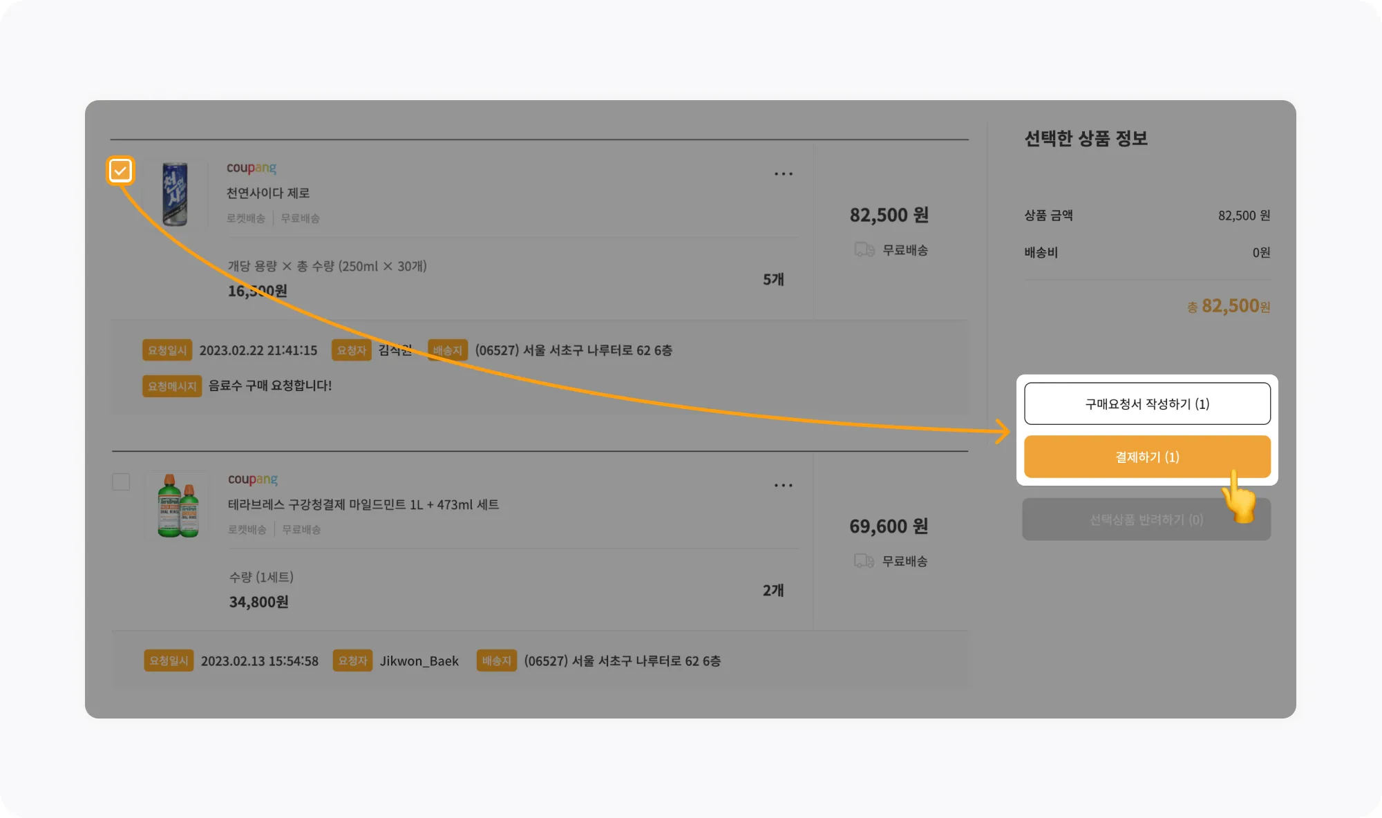 3. 구매하려는 상품을 선택해 구매요청서를 작성하거나 결제하면 완료! 주문 및 배송 현황은 에어서플라이 주문내역에서 확인해 주세요.  (관리자만 확인 가능)