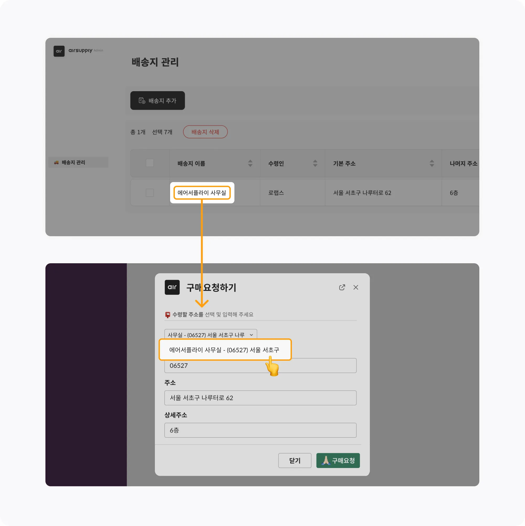 에어서플라이에 회사 배송지를 미리 등록하면, 직원들이 더 간편하게 요청할 수 있어요.