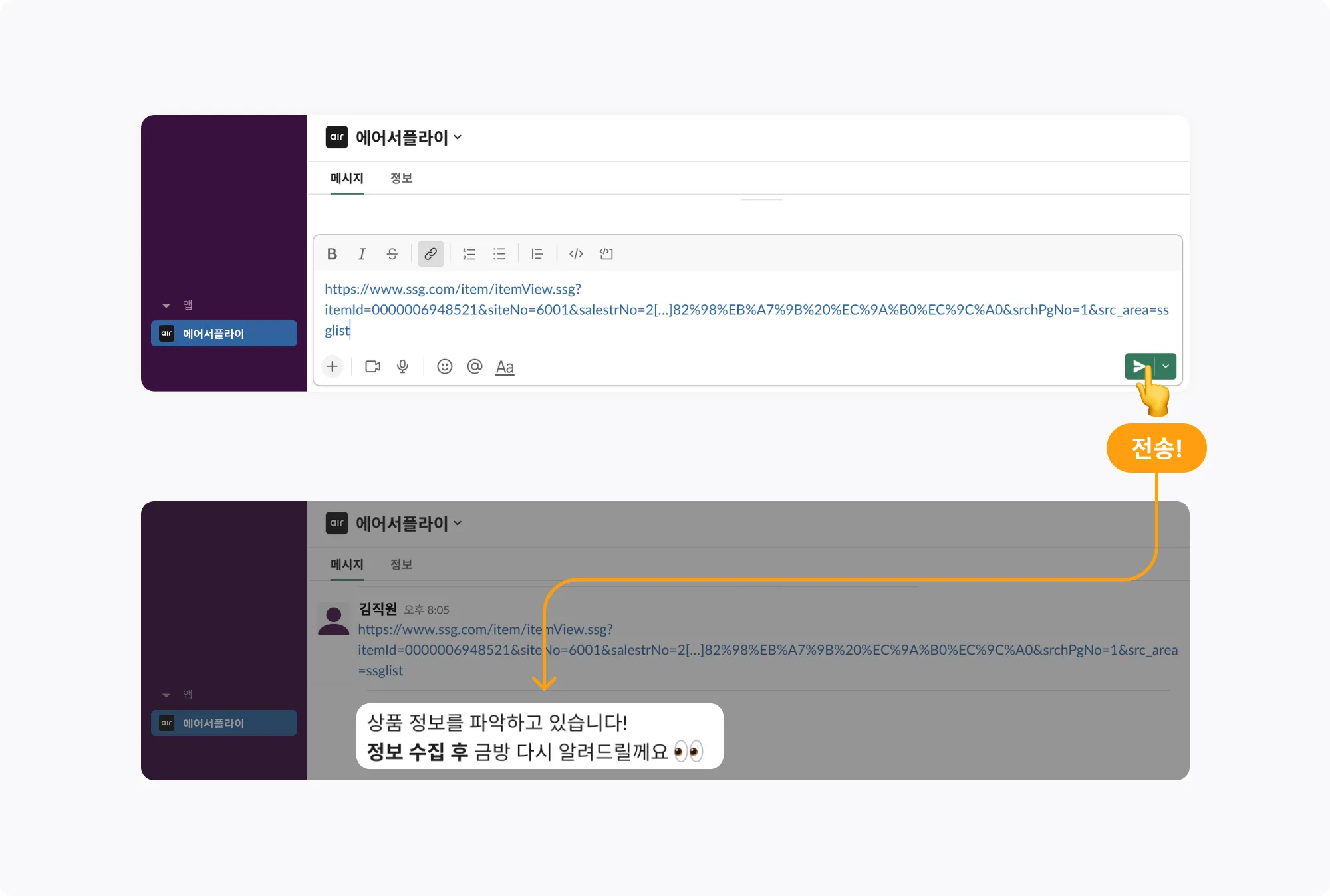 2. 에어서플라이 봇에게 복사한 링크를 전송하면, 봇이 상품 정보를 수집해요.