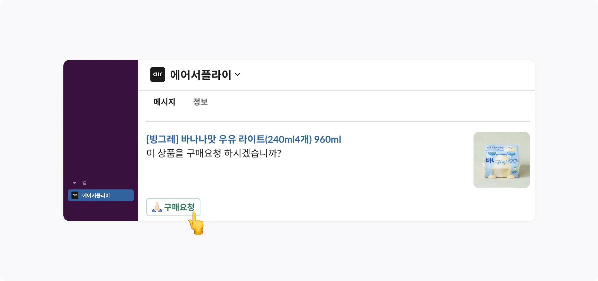 슬랙을 실행시킨 다음, 왼쪽 메뉴 하단의 [+ 앱 추가] 버튼 클릭 후 에어서플라이를 클릭하면 챗봇이 추가돼요. 혹은 여기에서 [slack에서 열기]를 클릭해주세요.