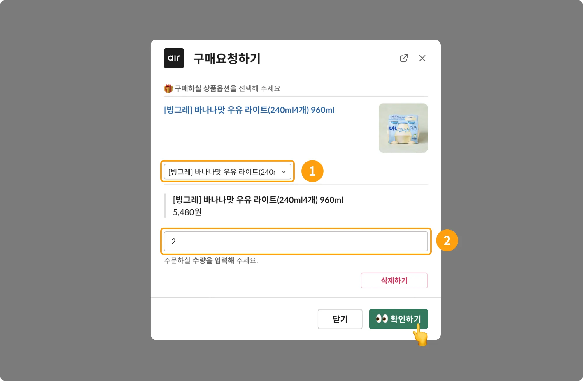 4. 원하는 옵션과 수량을 선택하고 [확인하기]를 클릭해요.