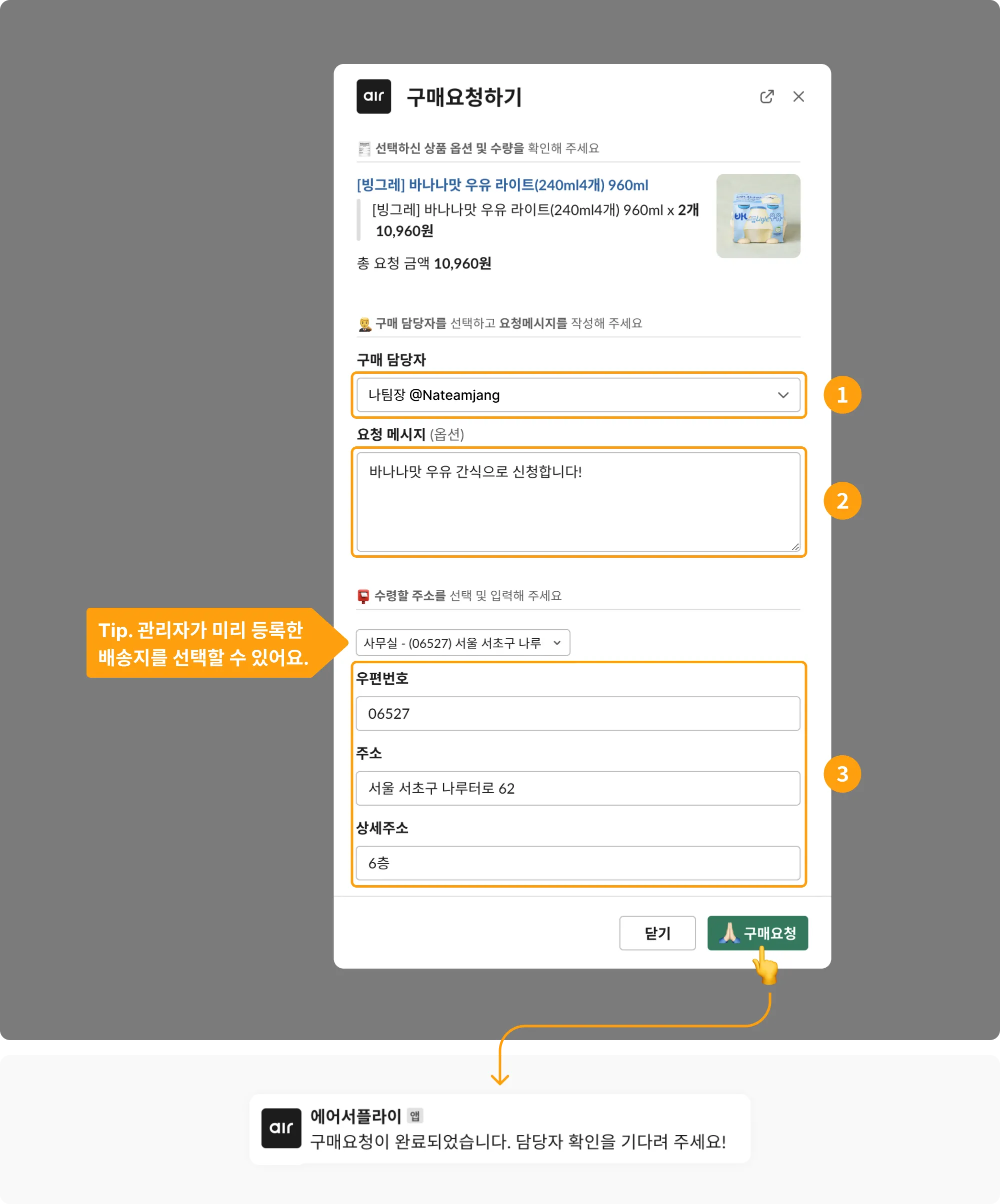 5. 요청서를 보낼 구매 담당자, 요청 메시지, 배송지를 입력하고 [구매요청] 버튼을 클릭하면 요청이 완료돼요.