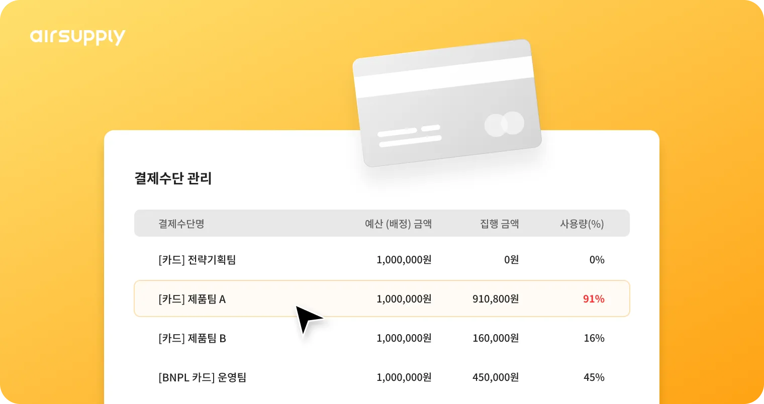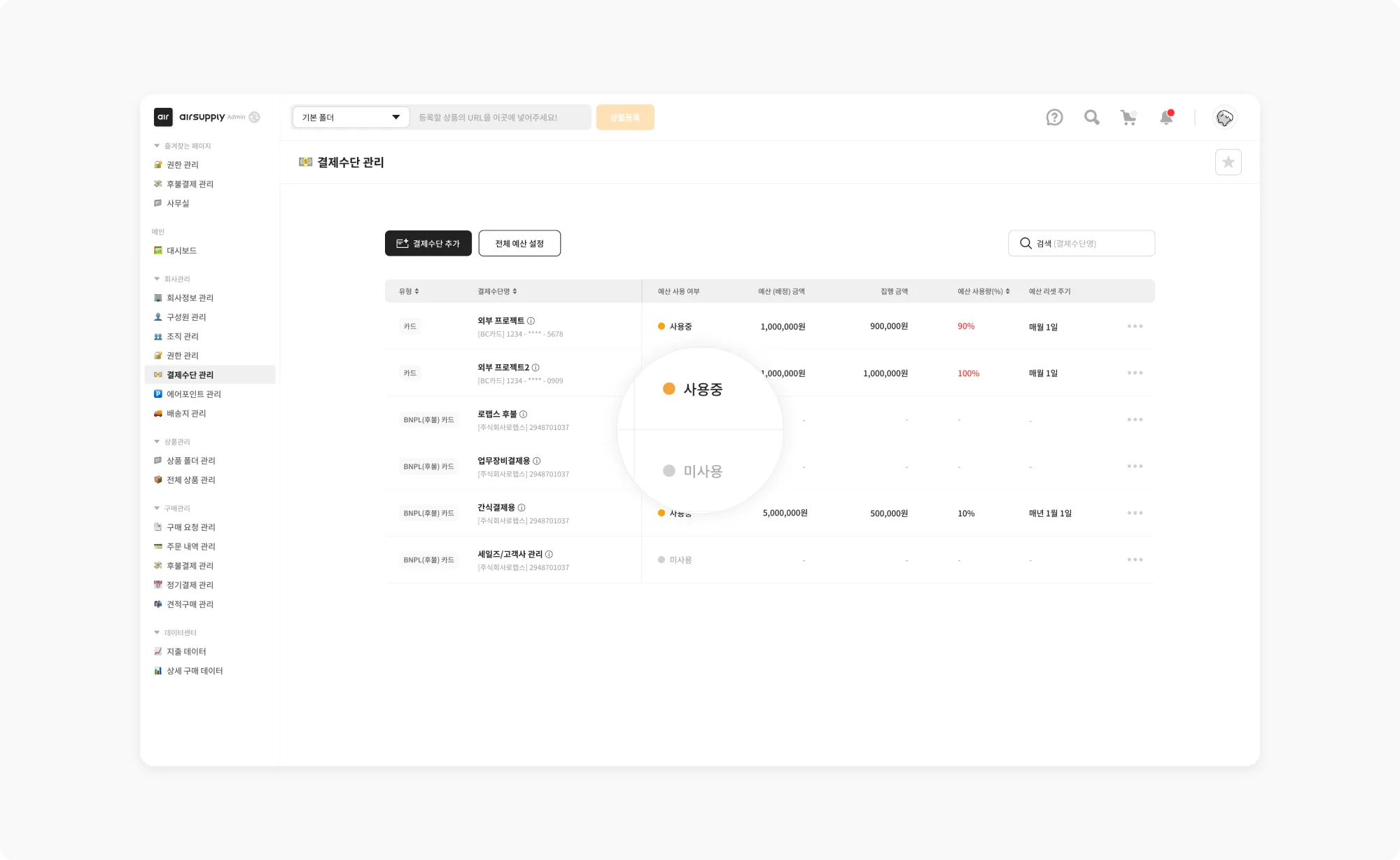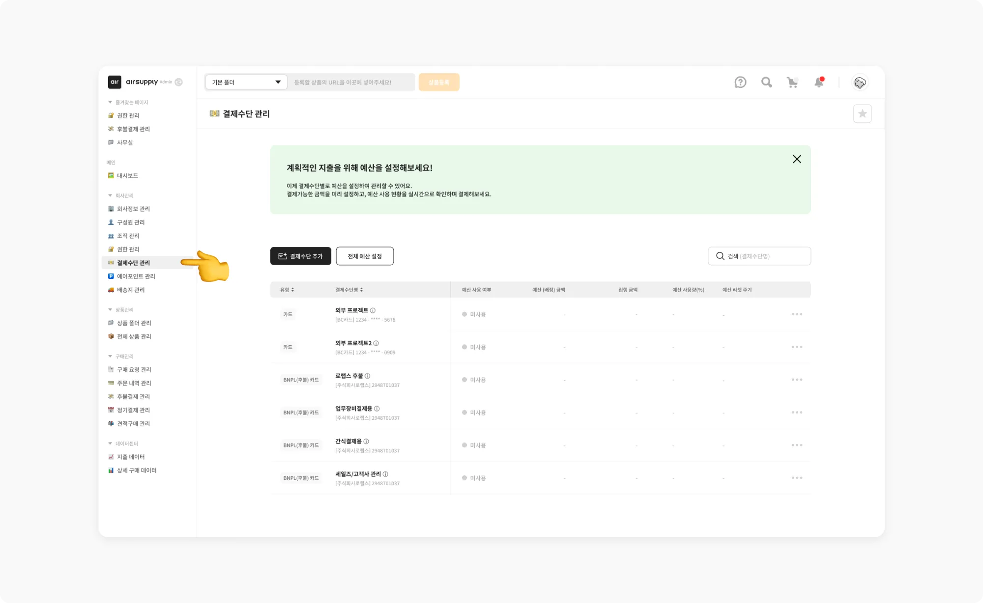 Admin 페이지의 결제수단 관리에서 ‘결제수단별’로 예산을 설정할 수 있어요. 해당 페이지의 접근과 예산 설정을 하려면 ‘결제수단 관리’ 권한이 필요해요.
