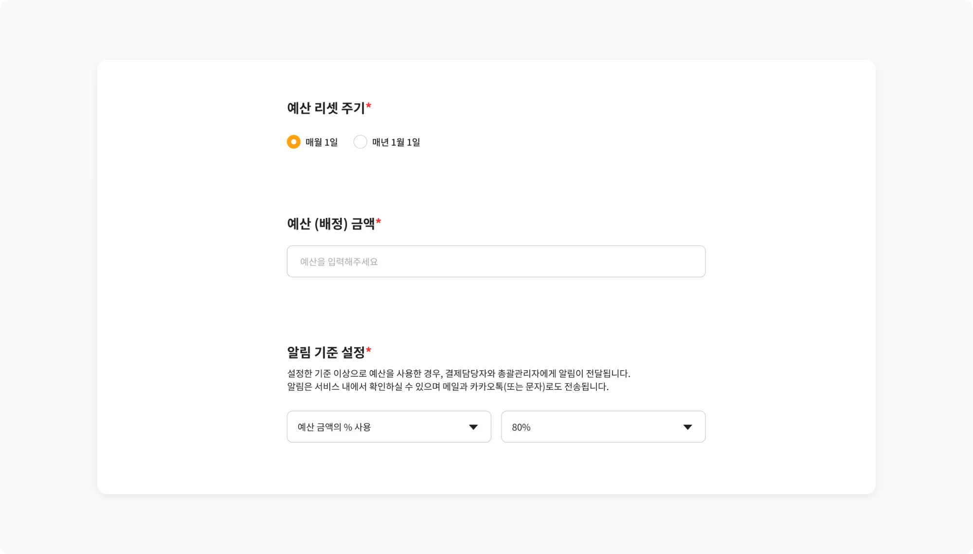 예산을 배정하면 특정 기준 이상을 결제했을 때 알림을 받도록 설정할 수 있어요. 설정한 기준 이상으로 예산을 사용한 경우, 결제담당자와 총괄관리자에게 알림이 전달돼요.