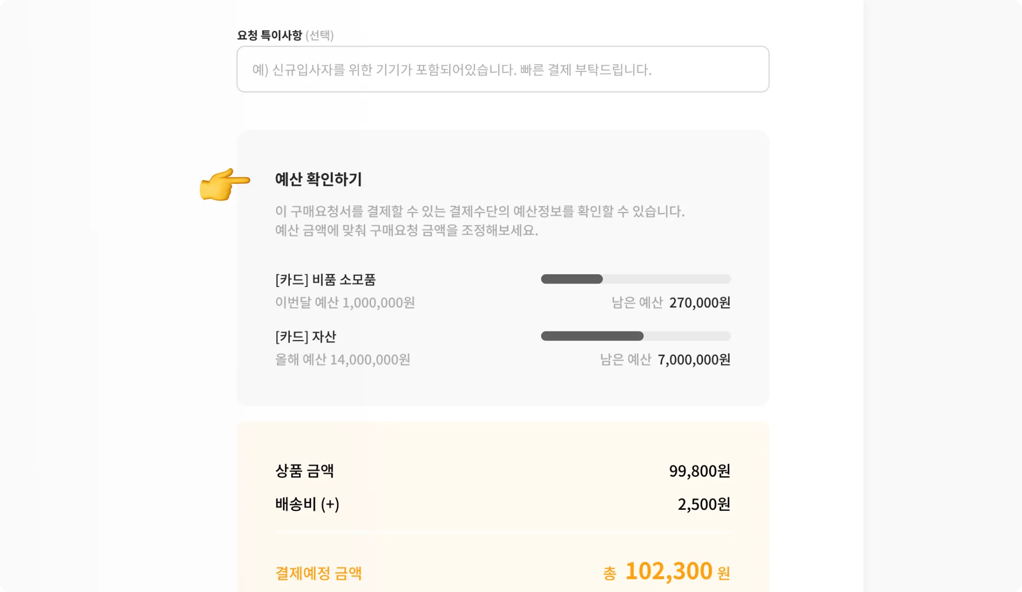 내가 속한 조직에 구매요청을 할 때, 결제가능한 예산을 미리 확인하고 요청 금액을 조정할 수 있어요. 여러 조직에 속해있을 경우 각 조직의 결제수단 별 예산이 표기돼요.