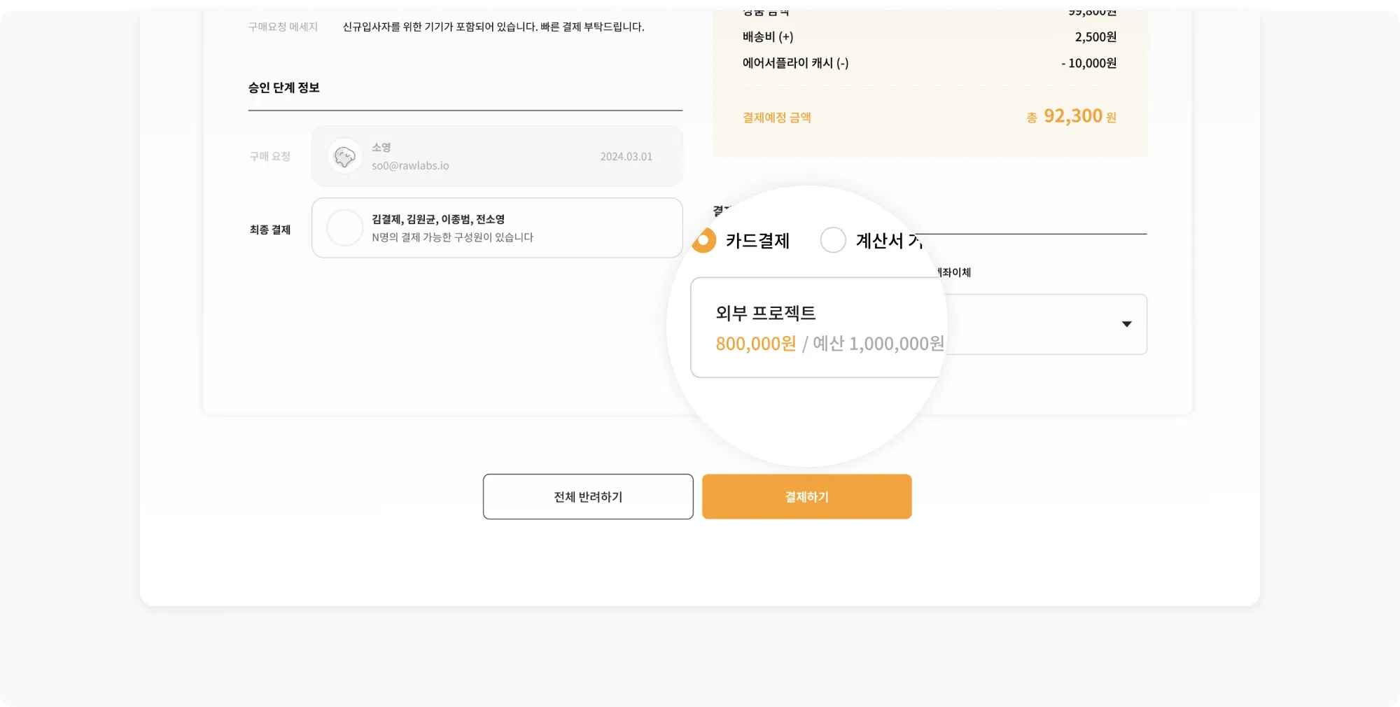결제담당자는 결제 방법을 선택할 때, 각 결제수단에 배정된 예산과 남은 예산을 확인할 수 있어요. 예산이 부족하다면 결제할 수 없어요.
