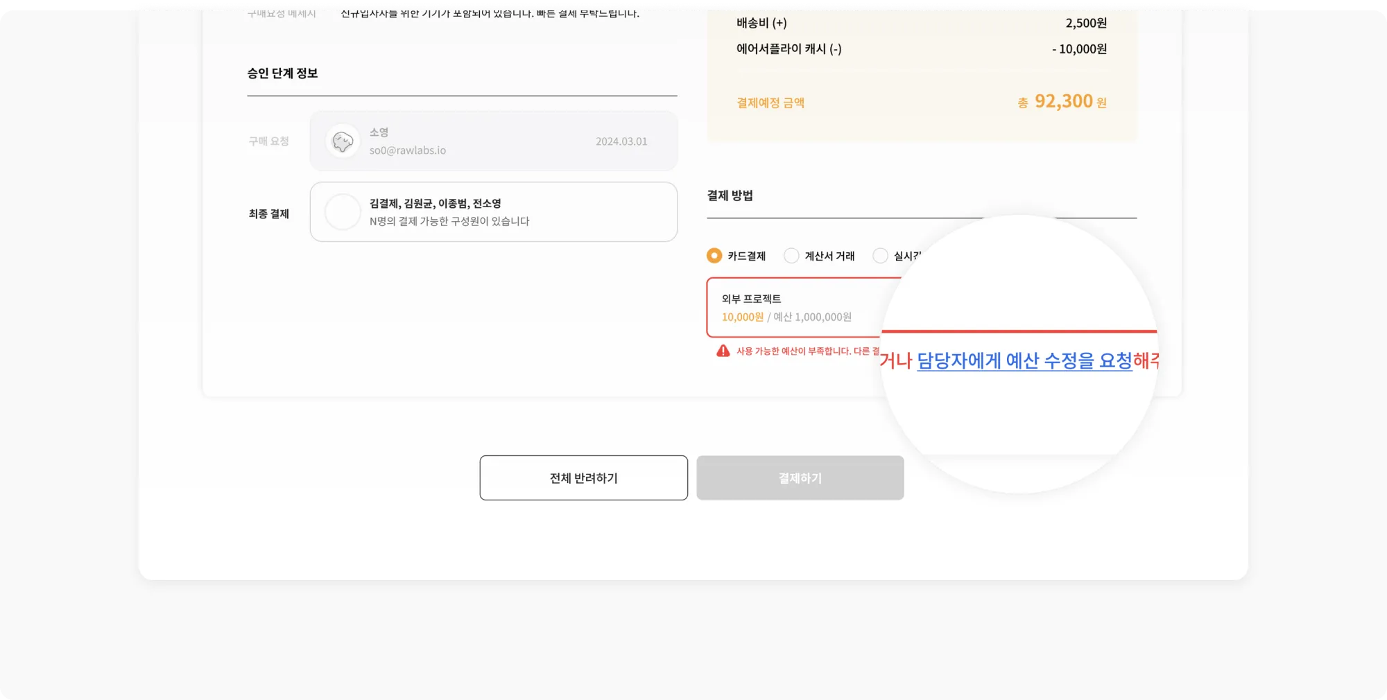 예산이 부족하다면, ‘결제수단 관리’ 권한을 가진 담당자에게 예산 수정을 요청할 수 있어요. ’담당자에게 예산 수정을 요청’을 클릭하여 추가요청 금액을 입력하고 요청하세요!