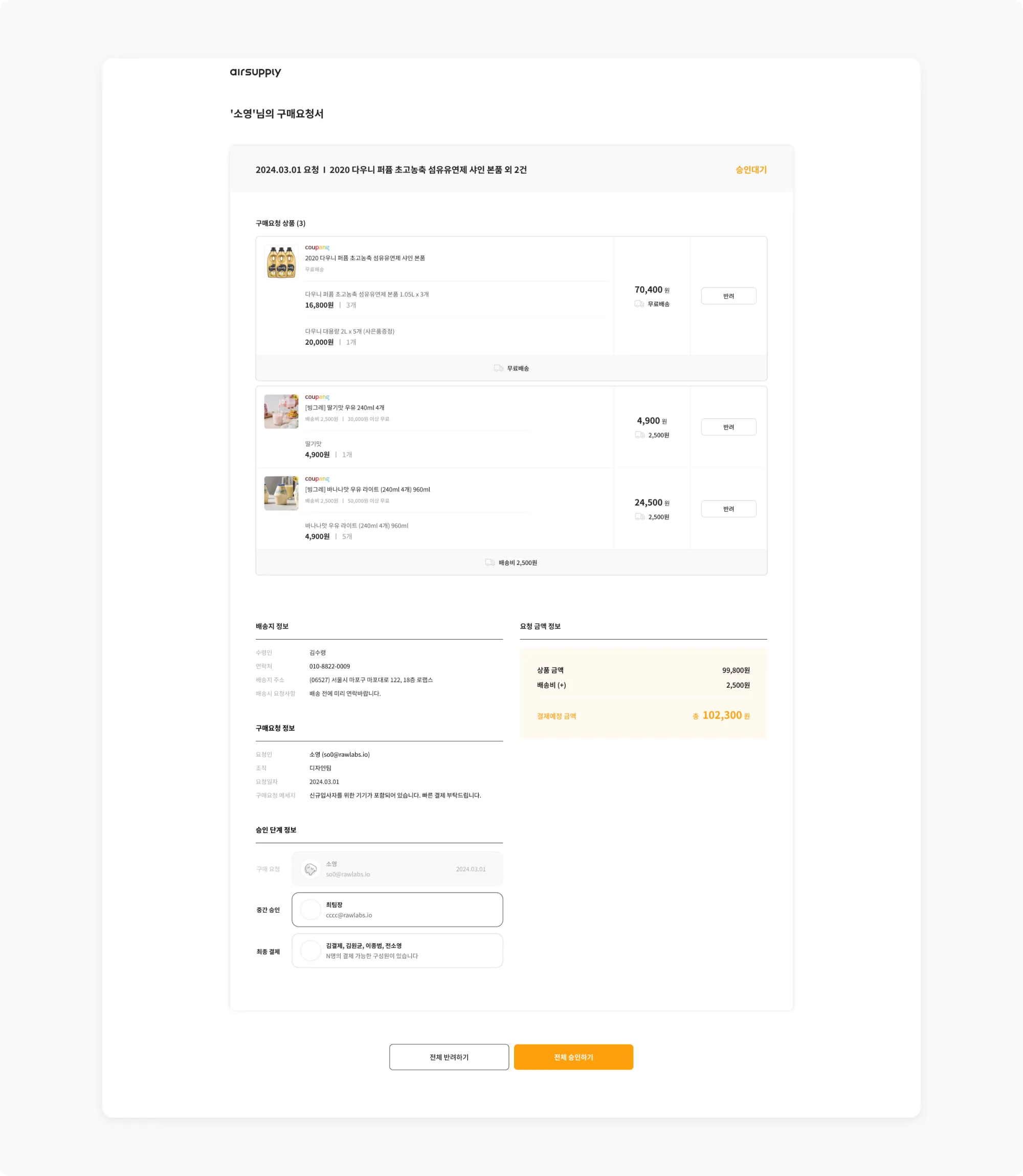 승인 또는 반려를 먼저 진행한 담당자가 ‘승인 담당자’로 저장돼요.