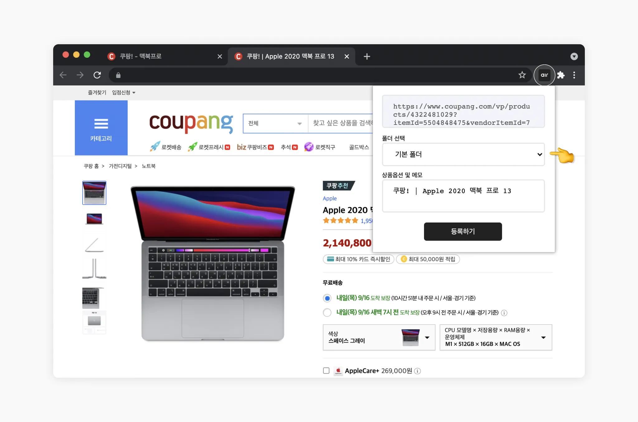 쿠팡의 경우 옵션에 따라 사이트 링크가 변동하므로 구매하고자 하는 상품의 옵션까지 선택하고 확장 프로그램을 클릭해주세요!