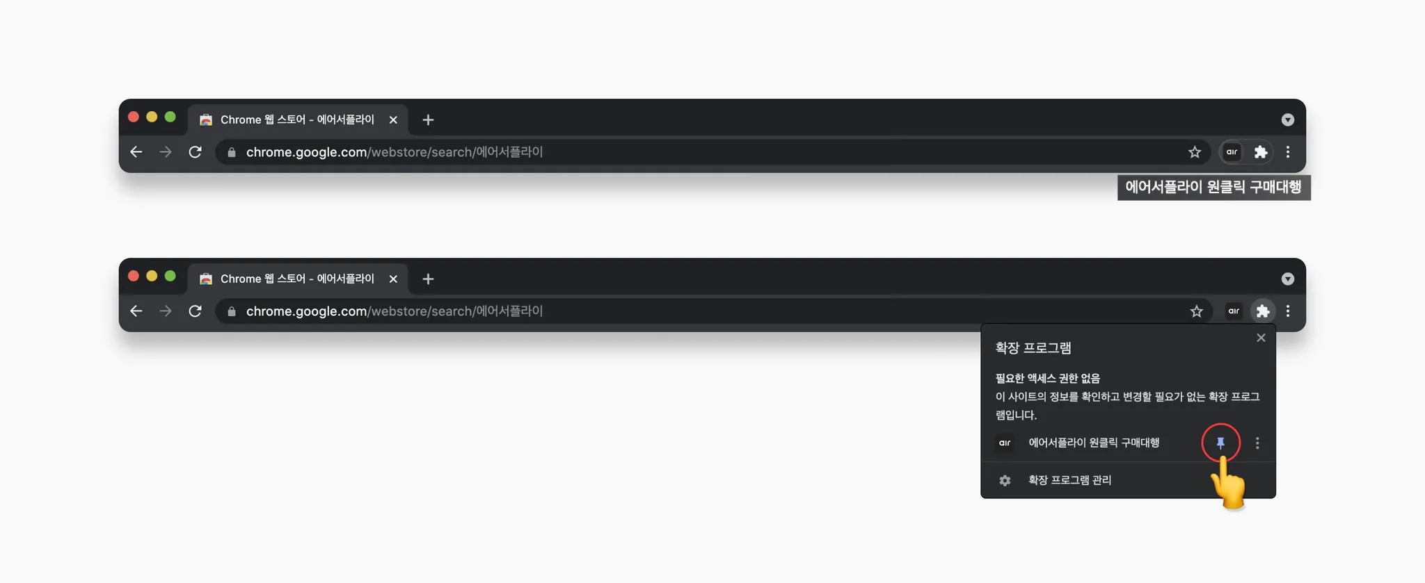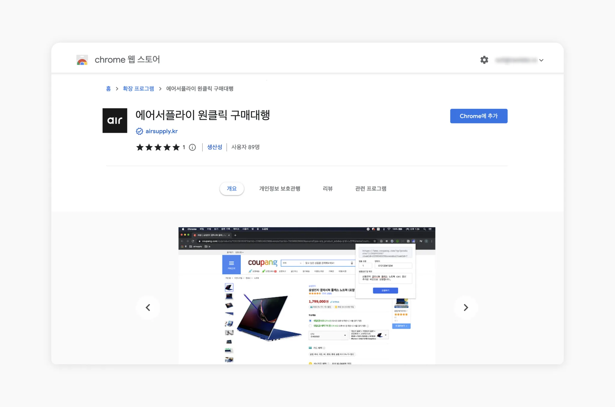 1. 크롬웹스토어에서 에어서플라이 원클릭 구매대행을 검색해요.