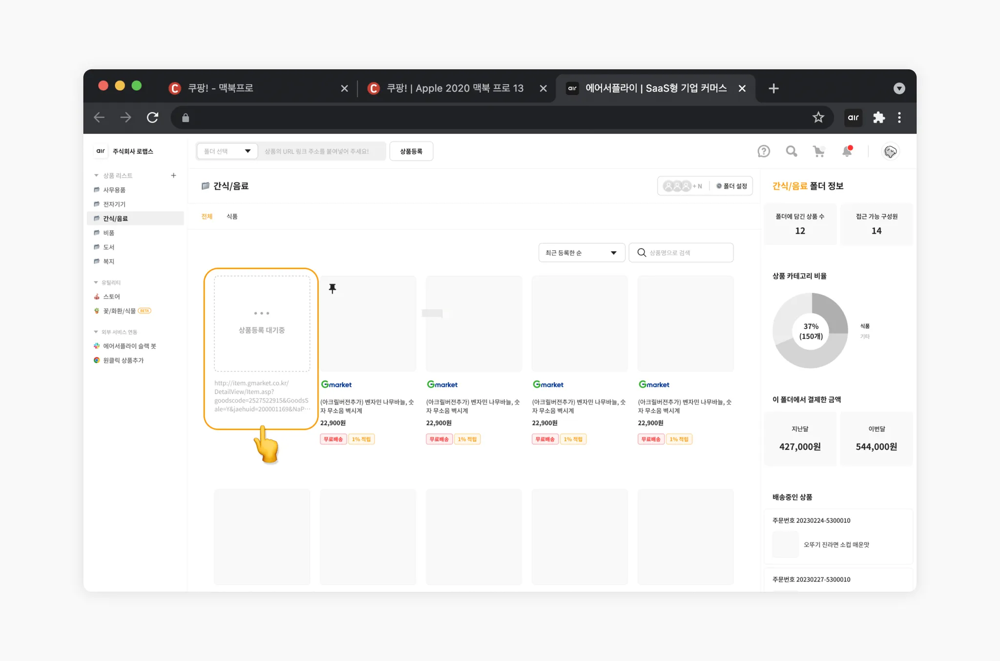 2. 에어서플라이 상품리스트 페이지에 들어가보면 등록 요청한 상품이 등록 완료된 것을 확인할 수 있어요. (평균 상품등록 대기시간 1분 내외).