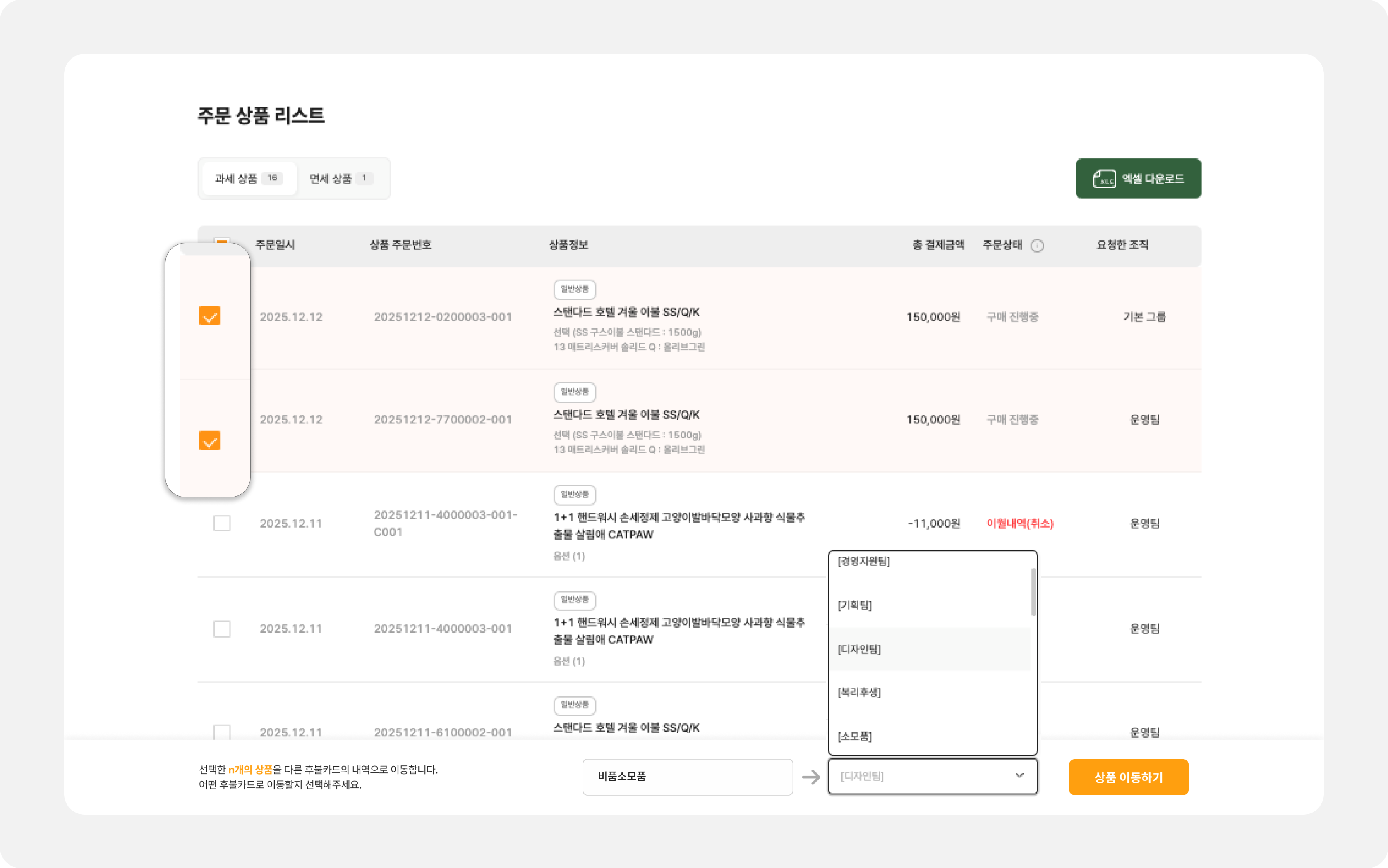 • Step 2: 이동할 결제 내역들을 체크박스로 복수 선택합니다.
